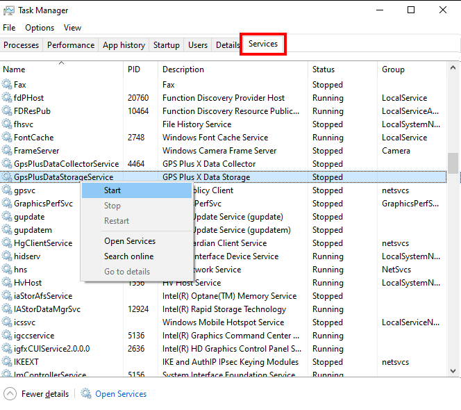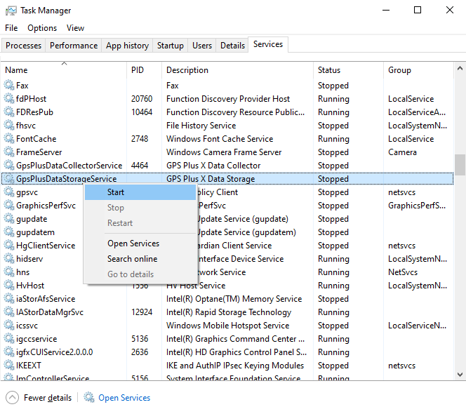 Please check the Services tab of the Windos Task Manager to see if the ‘GpsPlusDataStorageService’ is still running and start it if necessary. (Expand card for more details)